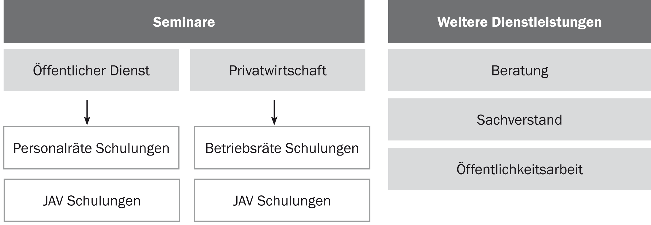 Unser Leistungsspektrum umfasst nicht nur ein umfangreiches Seminarangebot, sondern auch weiterführende Dienstleistungen wie Beratung, Sachverstand und Öffentlichkeitsarbeit. Wir möchten unsere Kunden in allen Belangen zur Seite stehen und bieten deshalb einen umfassenden Service aus einer Hand.